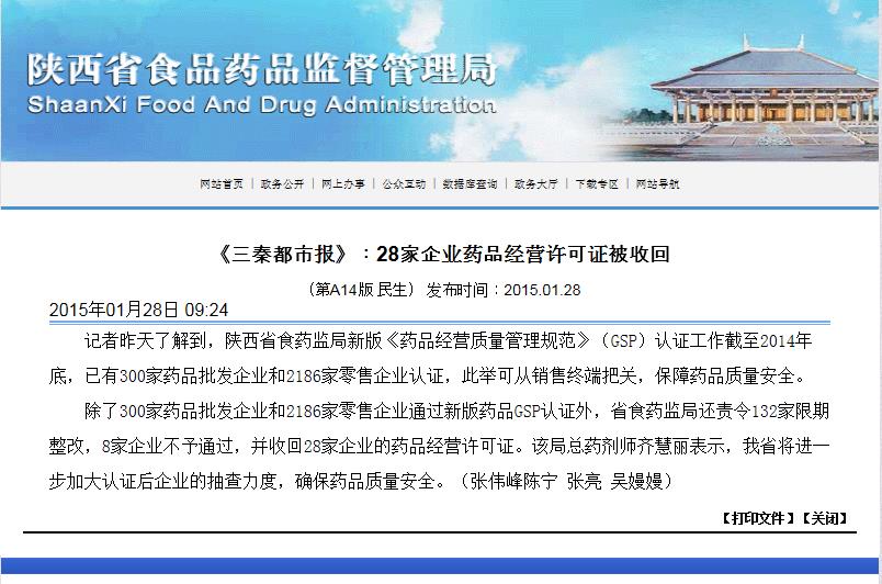 陕西食药监局:28家企业药品谋划允许证被收回日期:2015-01-29